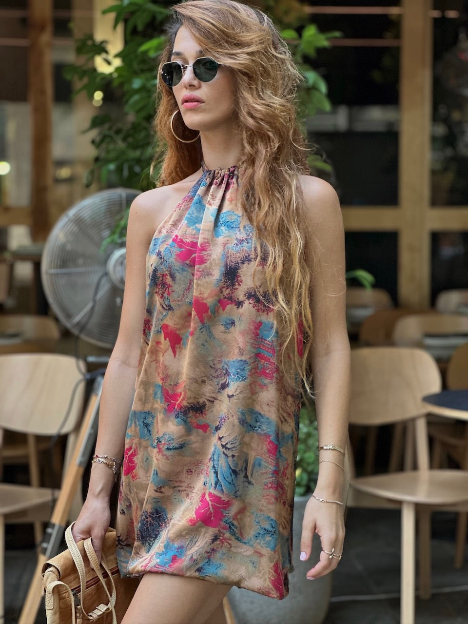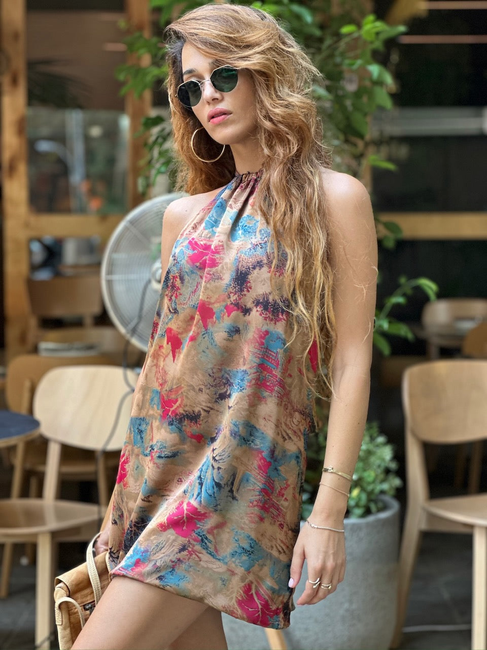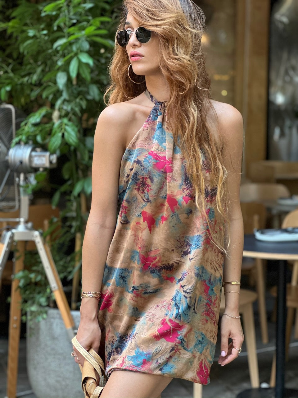 שמלת מיני בגזרת קולר וגב פתוח מבדי סאטן דמויי משי מודפסים.