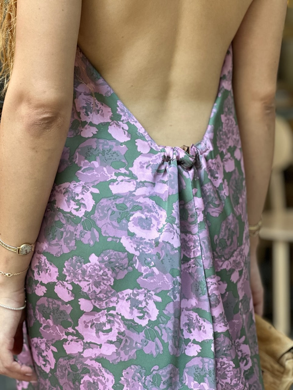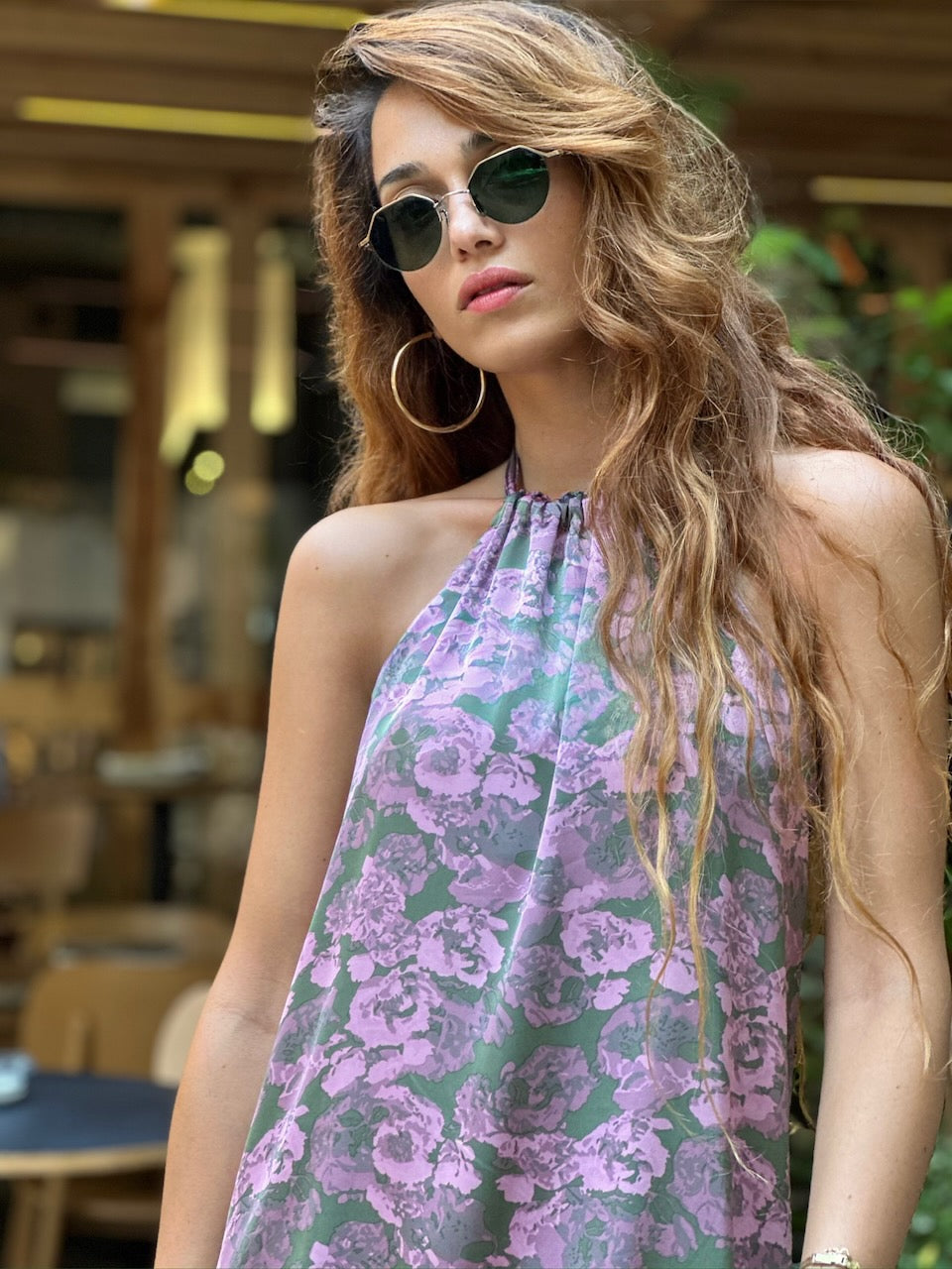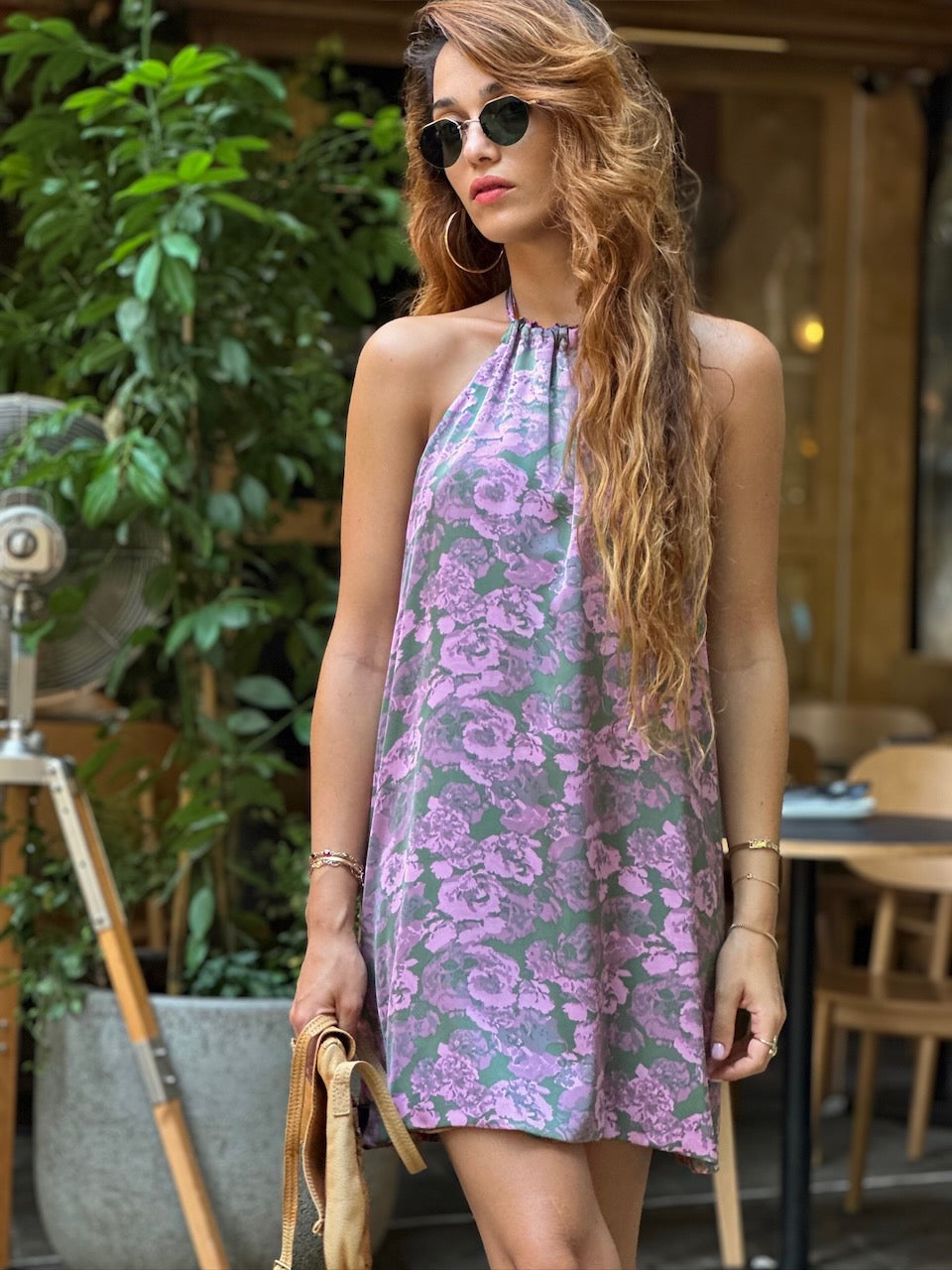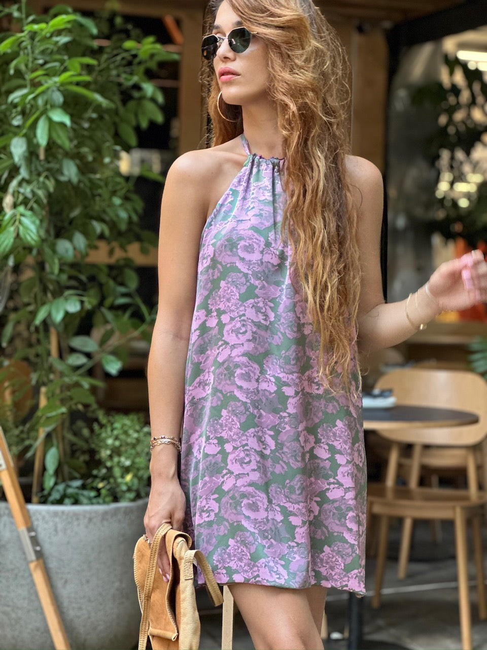 שמלת מיני בגזרת קולר וגב פתוח מבדי סאטן דמויי משי מודפסים.
