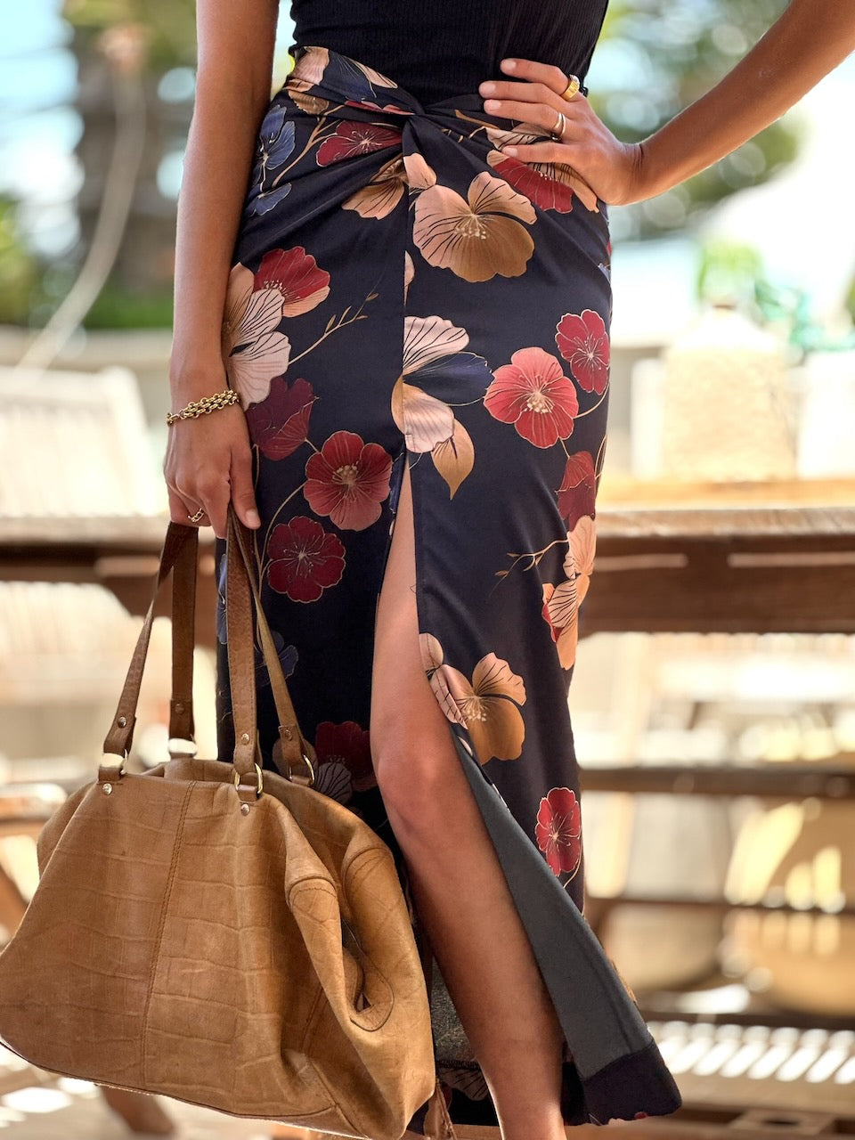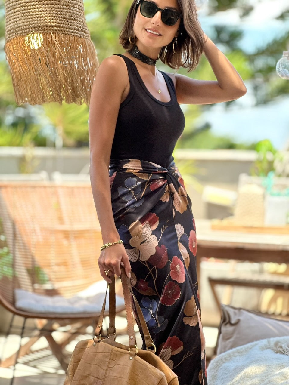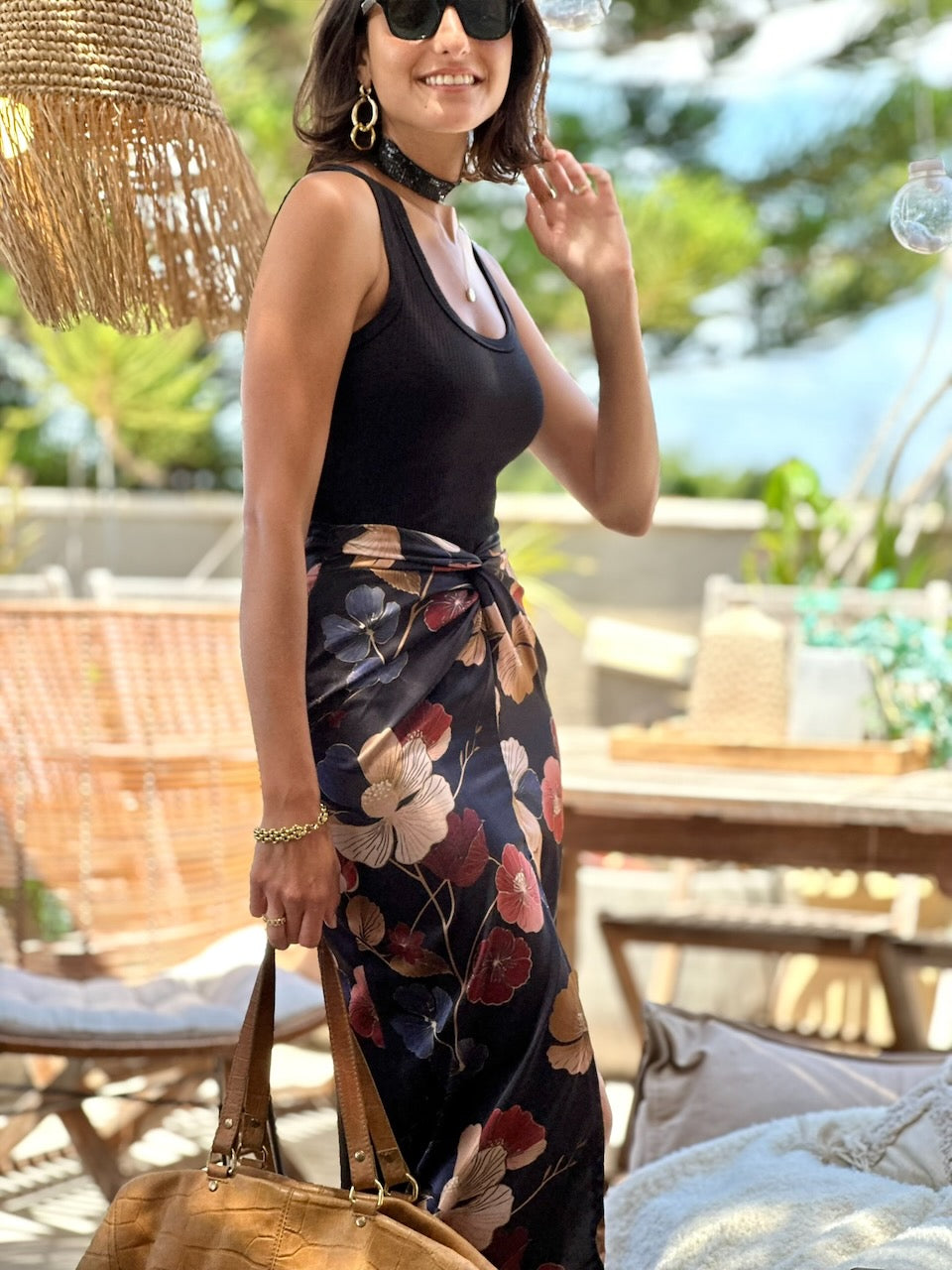 חצאית מקסי ונוס - שחור פרחים ניוד בורדו