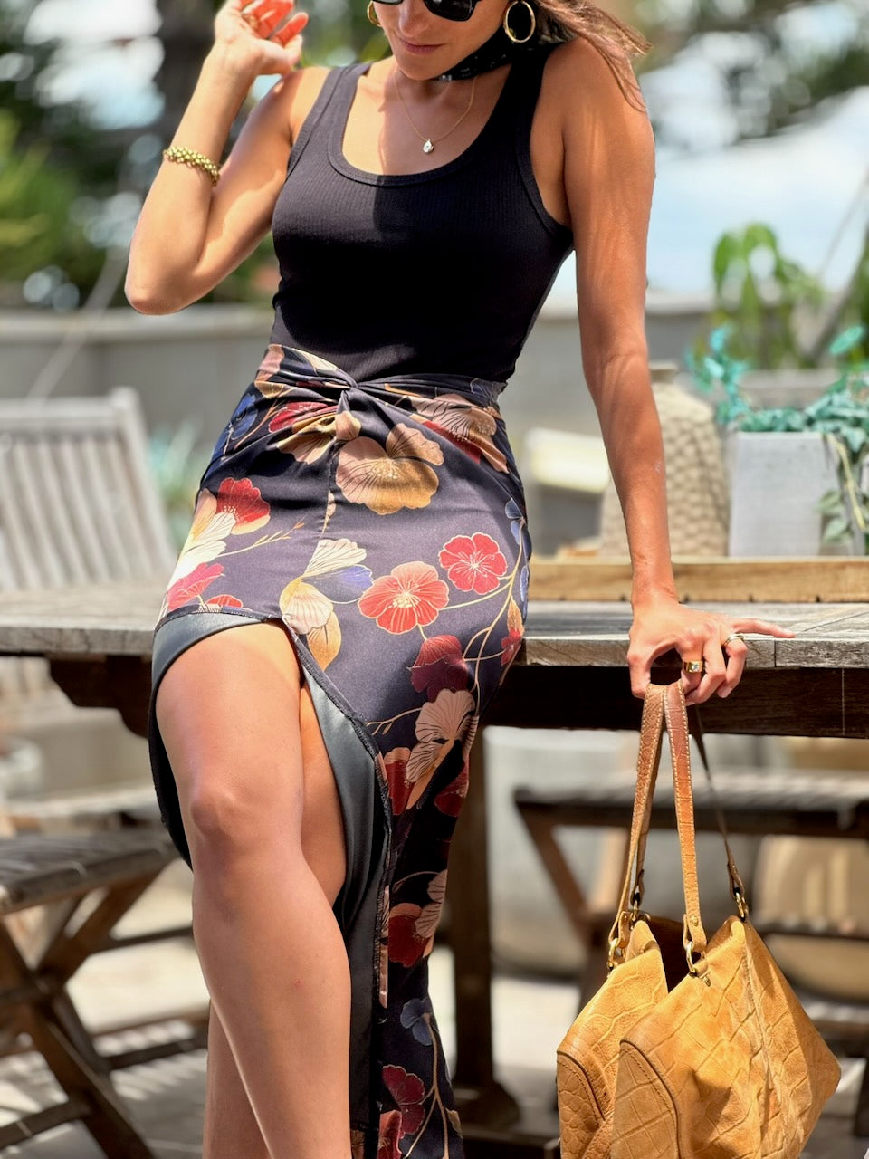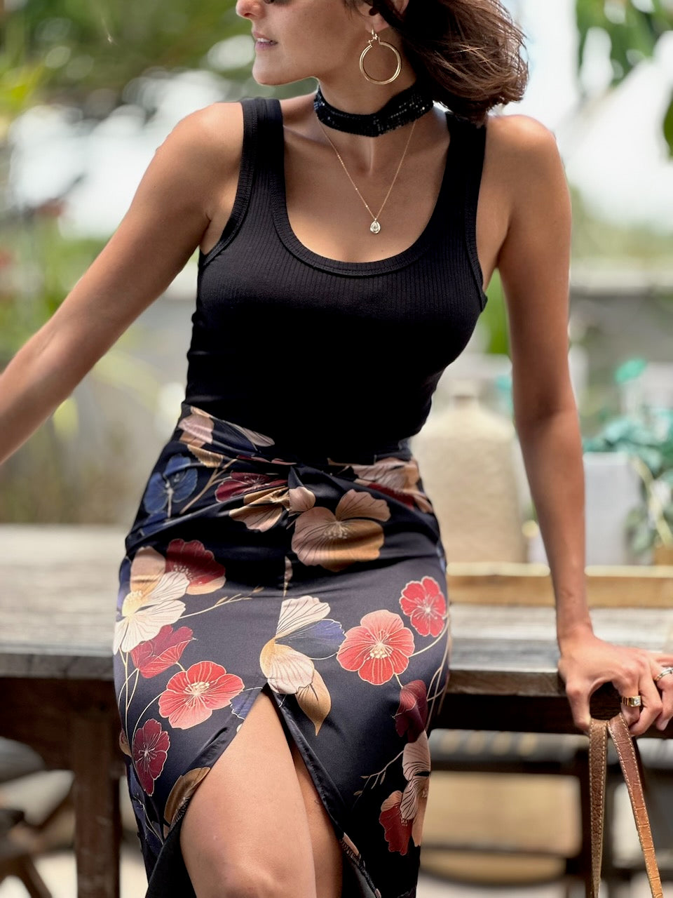 בדי סאטן רכים נעימים וקלילים בפרינטים קיציים בצבעים חלומיים. עם רוכסן צד, גומי מאחור, וקשירה אחורית לאפשרות הקטנה נוספת בהיקף המותן.